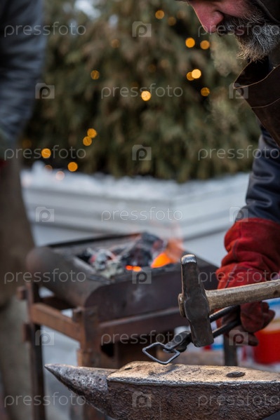 Московские сезоны. Традиционное ремесло. Работа кузнеца по металлу на праздновании Масленицы (Масленичной недели). Русские традиции. Тверская улица. Москва. Россия