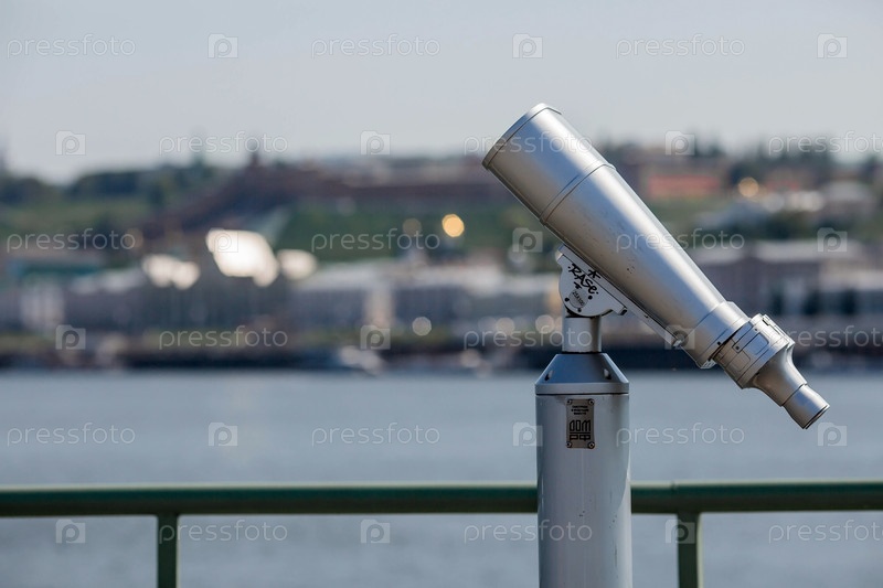 Монетный бинокль. Смотровая площадка в Нижнем Новгороде с видом на реку и Кремль. Россия, Нижний Новгород, август 2023 г