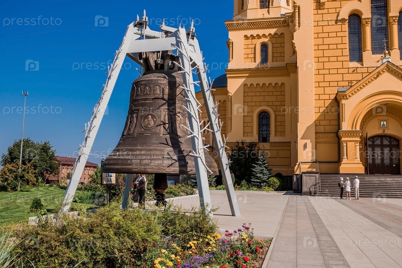 Соборный колокол на территории собора Александра Невского в Нижнем Новгороде на Стрелке. Россия, Нижний Новгород, август 2023 г