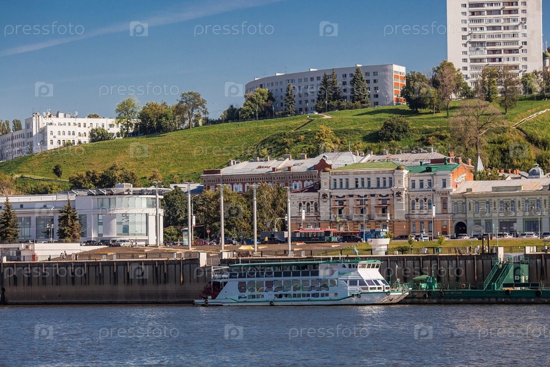 Прекрасный вид на Нижний Новгород с реки Волги в солнечный летний день. Россия, Нижний Новгород, август 2023 г
