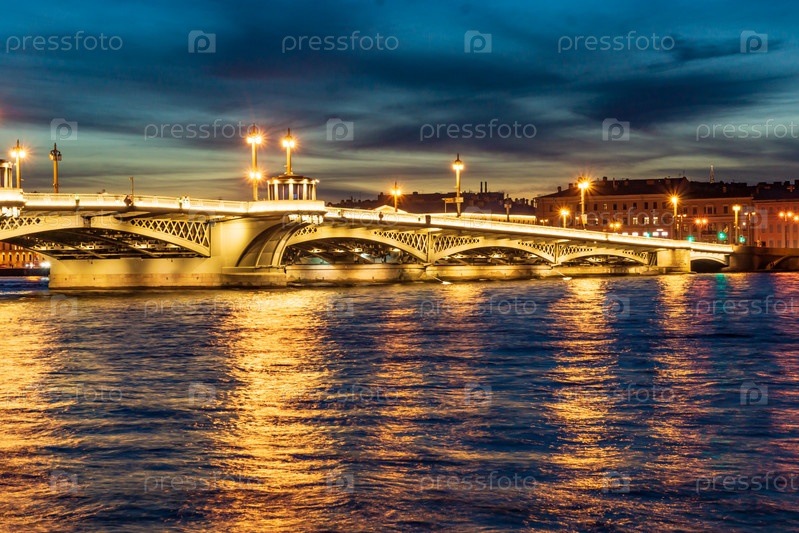 Вечерний вид с Английской набережной на Благовещенский мост в Санкт-Петербурге