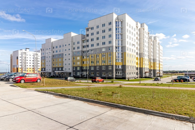 Красивое современное многоэтажное здание в новом районе города. Вид из окон многоквартирного панельного дома