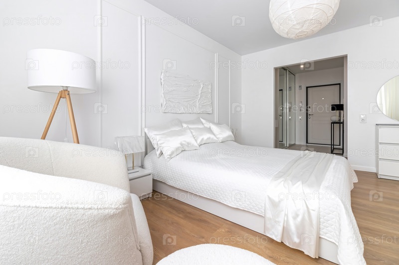 Современная спальня в белых тонах с белой мебелью