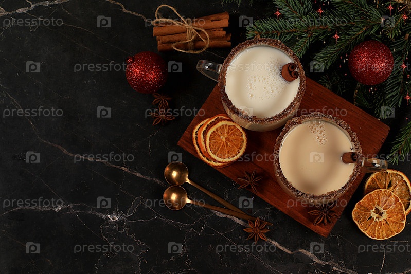 Эгг-ног с корицей, мускатным орехом и имбирным молочным напитком для рождественских и зимних праздников на фоне еловых веток и украшений. Согревающий молочный напиток в холодное время года, праздничная композиция,