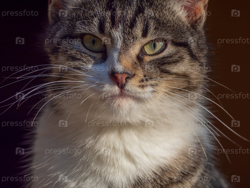 Прямо на вас смотрит кот с большими зелеными глазами. Портрет милого серьезного трехцветного кота с большими зелеными глазами и белой рубашкой спереди
