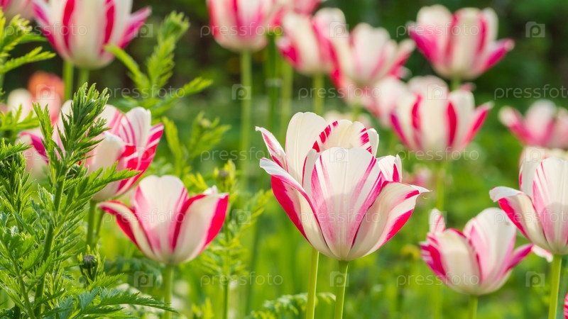 Красивый естественный цветочный фон для обоев экрана. Цветущие белые цветы с красными полосатыми тюльпанами в зеленой траве