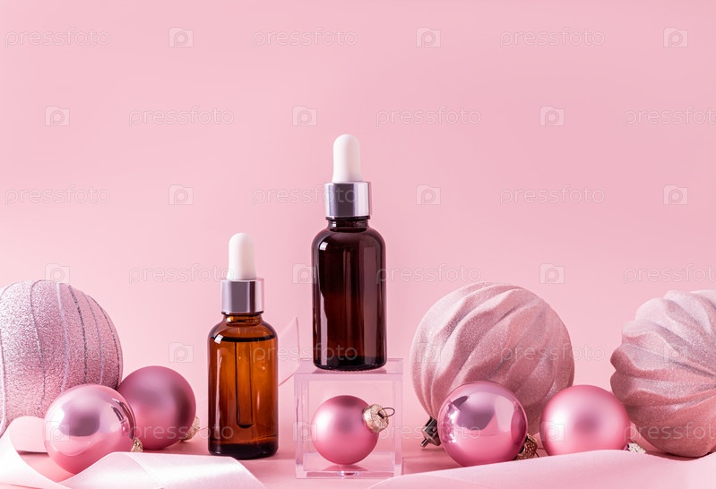 Два косметических флакона со средством ухода за собой в новогодней композиции презентации продукта. Пустая упаковка для бутылок. Передний план. макет