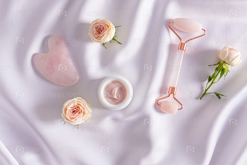 Нежная красивая композиция из инструментов, крема, бутонов маленьких роз на белом атласе. Вид сверху. Плоская планировка. Концепция ухода за кожей в домашних условиях