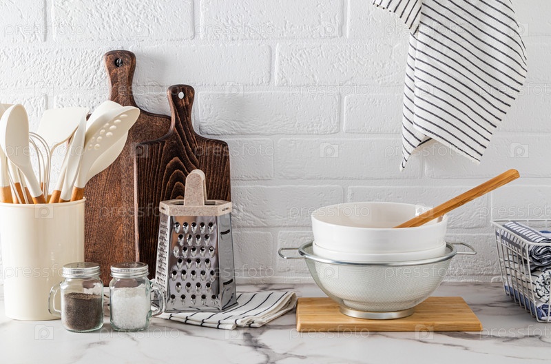 Набор различных кухонных инструментов из экологически чистых материалов на мраморной белой столешнице. Передний план. Уютный дом без мусора