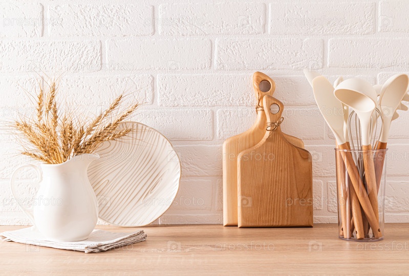 Светлый кухонный фон с деревянной экологически чистой кухонной утварью и кувшином с початками кукурузы. Современное кухонное пространство. Уютный дом