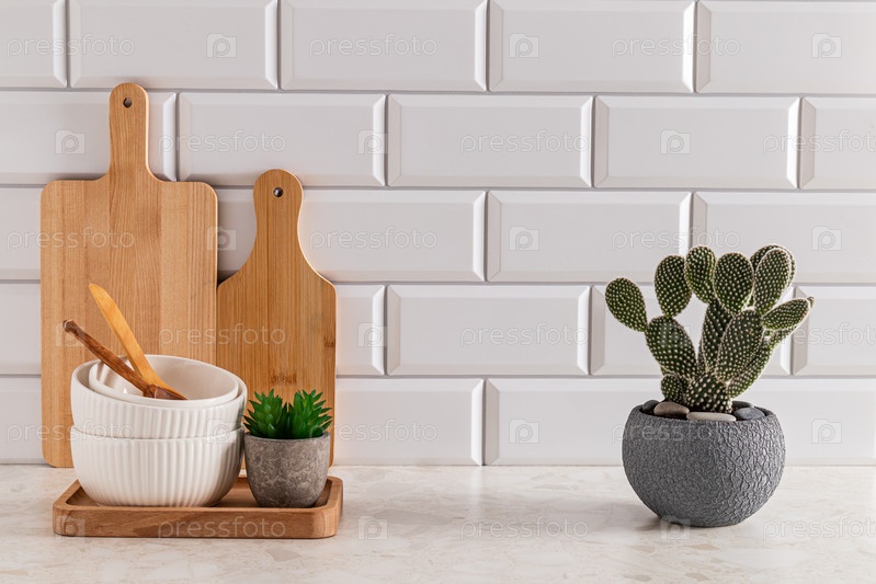 Набор керамических мисок и разделочных досок на каменной светлой столешнице на современной кухне с опунцией в горшке и кактусом. Передний план. минимализм