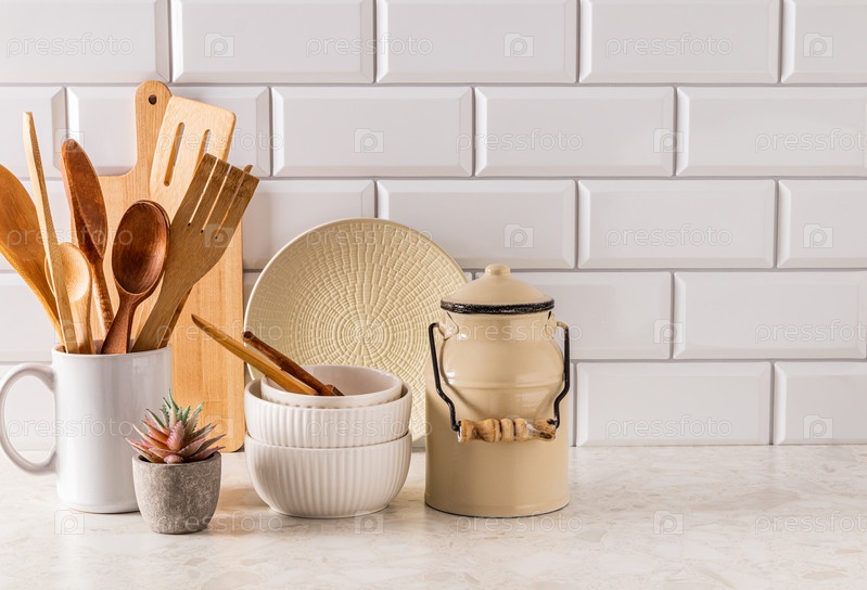 Экологичная кухонная утварь на светлой каменной столешнице на фоне стены из белого кирпича. Копия помещения. Экологичная кухня