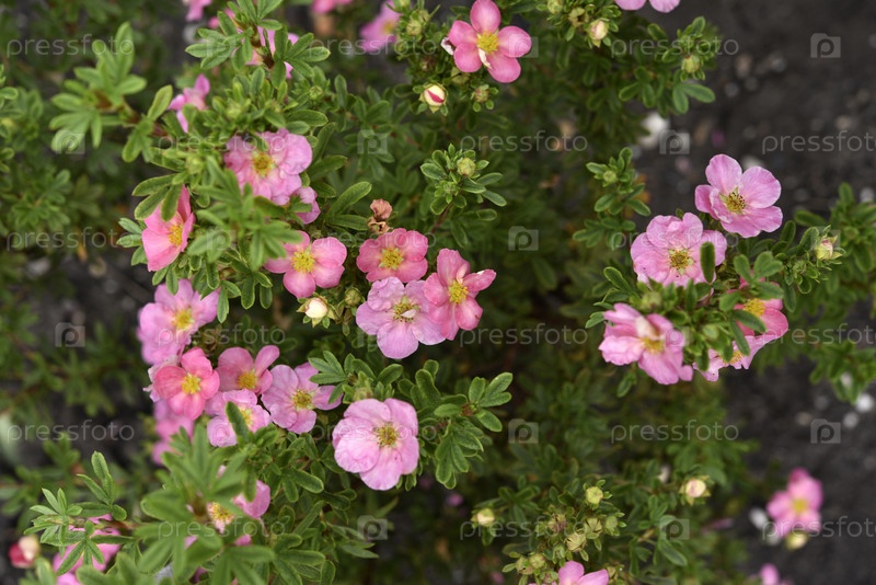 Красивые розовые цветы лапчатки на зеленом кусте. Маленькие красные цветки розоцветных