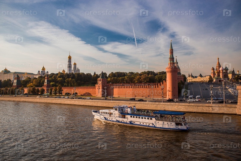 МОСКВА, РОССИЯ - 26 СЕНТЯБРЯ 2023 г.: Вид на Москву осенним вечером на закате. Кремлевские башни. Большой Кремлевский дворец, Успенский и Благовещенский соборы. Популярная туристическая достопримечательность