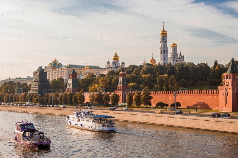 МОСКВА, РОССИЯ - 26 СЕНТЯБРЯ 2023 г.: Вид на Москву осенним вечером на закате. Кремлевские башни. Большой Кремлевский дворец, Успенский и Благовещенский соборы. Популярная туристическая достопримечательность