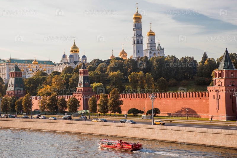МОСКВА, РОССИЯ - 26 СЕНТЯБРЯ 2023 г.: Вид на Москву осенним вечером на закате. Кремлевские башни. Большой Кремлевский дворец, Успенский и Благовещенский соборы. Популярная туристическая достопримечательность