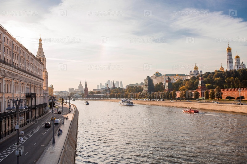 МОСКВА, РОССИЯ - 26 СЕНТЯБРЯ 2023 г.: Вид на Москву осенним вечером на закате. Кремлевские башни. Большой Кремлевский дворец, Успенский и Благовещенский соборы. Популярная туристическая достопримечательность