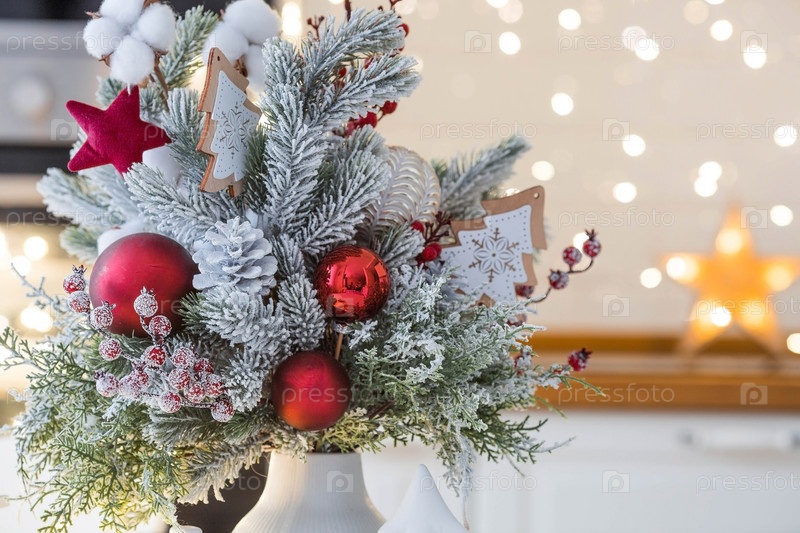 Еловый букет с красными ягодами, игрушками, хлопком на белом кухонном столе на фоне красивой гирлянды. Новогодние украшения в интерьере. Концепция подготовки к новогодним праздникам 2024