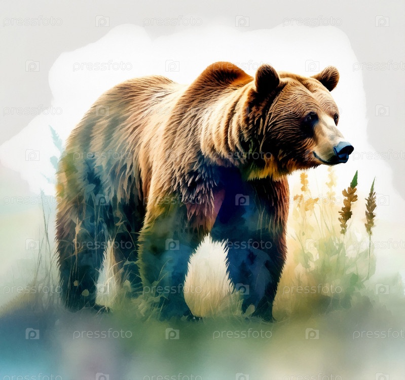 Медведь и трава акварелью