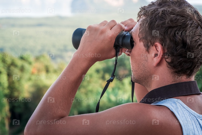 Молодой человек смотрит вдаль в бинокль
