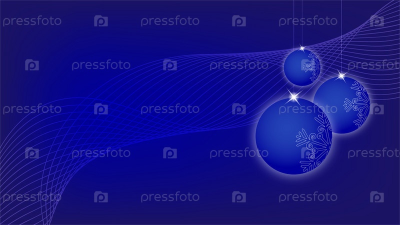Синий новогодний фон с тремя шарами и волнообразной лентой