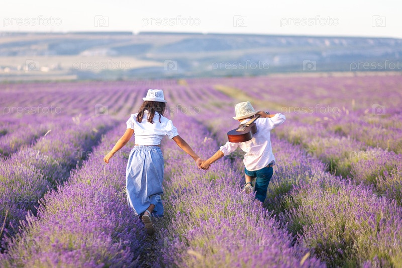 Мальчик с гитарой и девочка гуляют, держась за руки, по лавандовому полю
