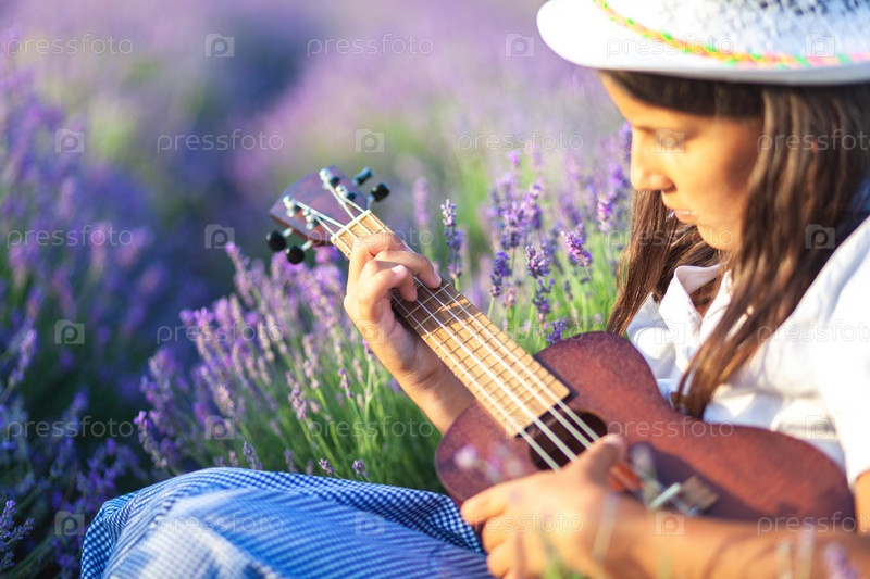 Портрет красивой деревенской девушки с каштановыми волосами, которая учится играть на гавайской гитаре в красивом месте среди цветов лаванды