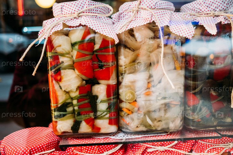 Стеклянные банки с традиционными турецкими домашними овощными соленьями