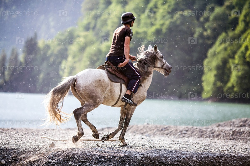 Всадник скачет верхом по берегу реки