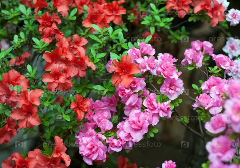 Цветущие красные и розовые азалии