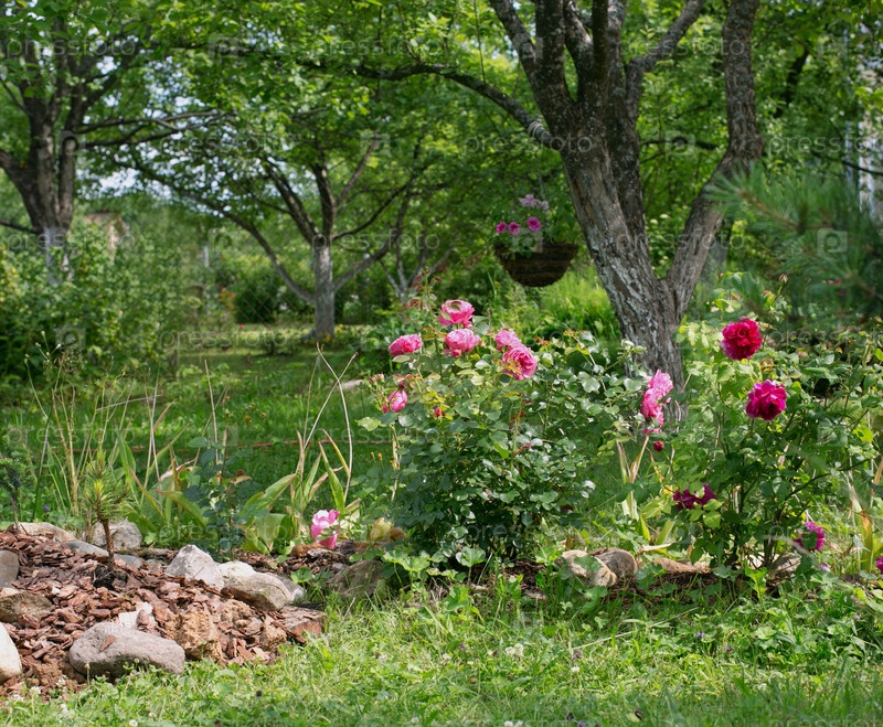 Сад с цветущими розами и петуниями в подвесной корзине