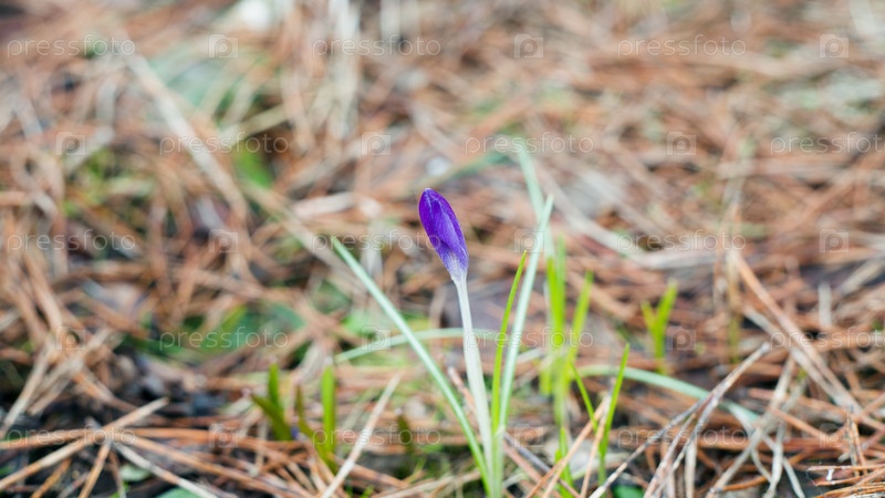 Бутон фиолетового крокуса на фоне прошлогодней листвы ранней весной