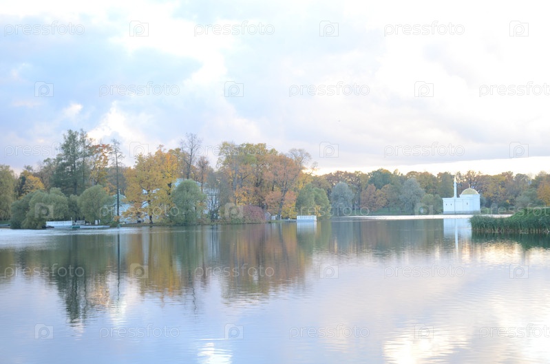 Большой пруд, павильоны Турецкая баня и Зал на острову в Екатерининском парке Царского села осенью. Город Пушкин, Санкт-Петербург
