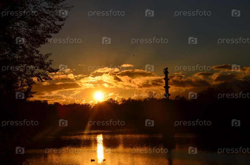Большой пруд, Чесменская колонна в Екатерининском парке Царского села на закате. Город Пушкин, Санкт-Петербург