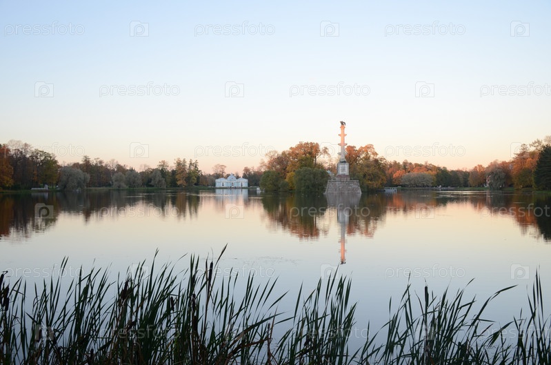 Большой пруд, павильон Грот и Чесменская колонна в Екатерининском парке Царского села осенью. Город Пушкин, Санкт-Петербург