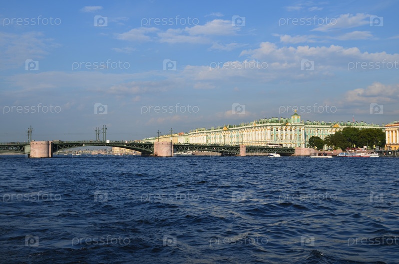 Вид со стороны Невы на Дворцовый мост и Зимний дворец (Эрмитаж) в Санкт-Петербурге, лето, солнечный, день, кораблики на пристани у Спуска со Львами