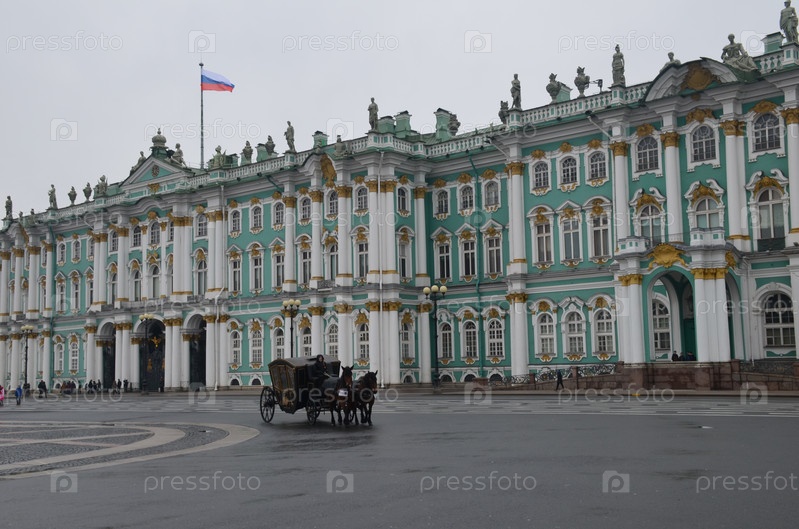 Карета проезжает мимо Зимнего дворца (Эрмитаж)по Дворцовой площади в Санкт-Петербурге