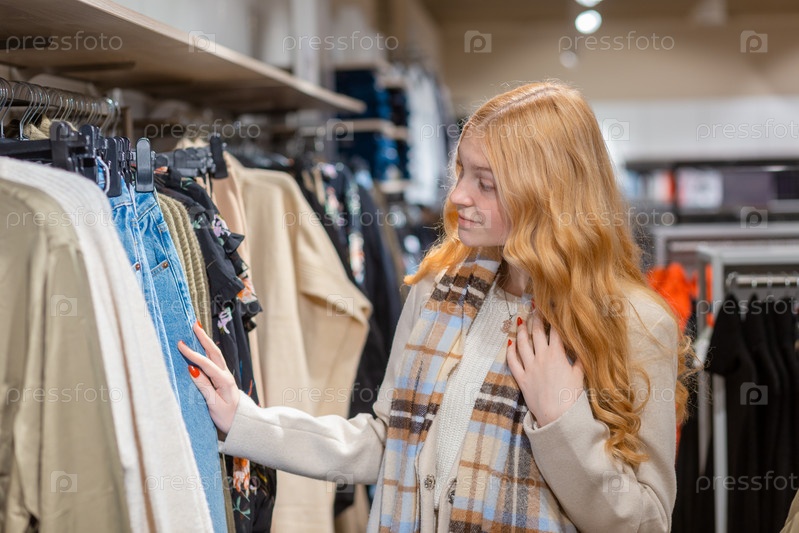 Молодая женщина выбирает одежду на вешалке в выставочном зале. Концепция продаж, моды, потребительства и людей