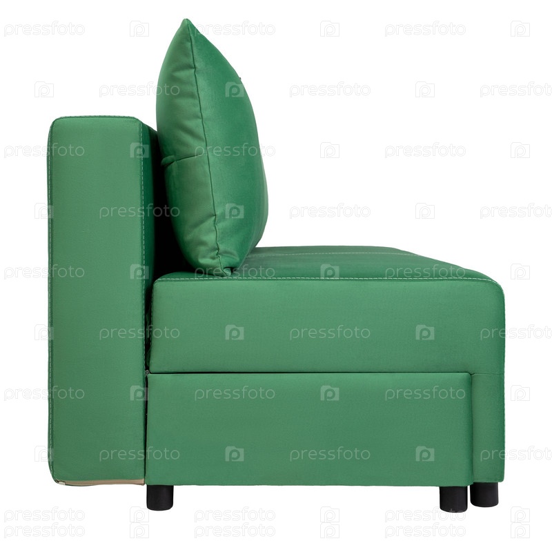 Зеленый уютный современный тканевый диван на белом фоне, вид сбоку