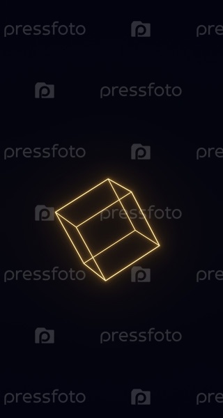 Каркасный куб неонового цвета парит на темном фоне, 3D-рендеринг