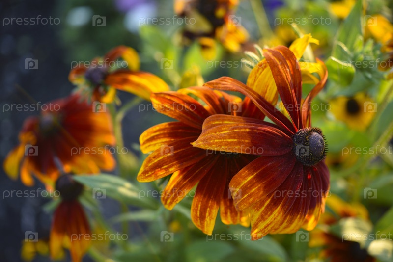 Красивые желто-красные большие цветы рудбекии на зеленом кусте в саду летом