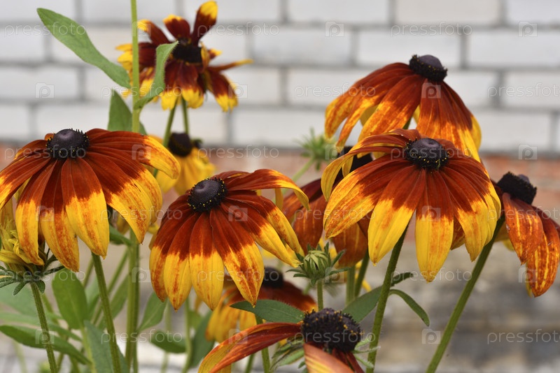 Красивые желто-красные большие цветы рудбекии на зеленом кусте в саду летом