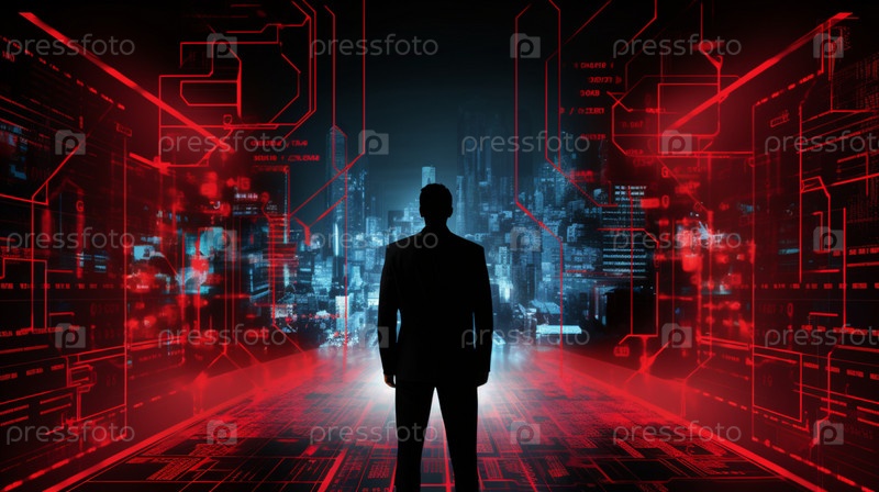 Мужчина в костюме стоит спиной к нам, справа и слева красные нити интернета, а вдали виден город