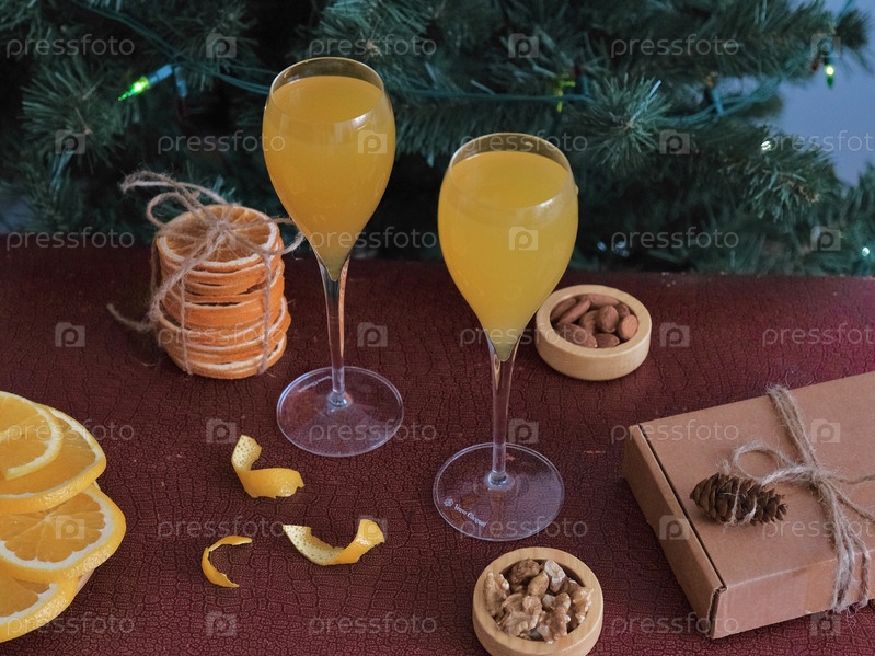 В бокалах — коктейль «Мимоза» с шампанским и апельсиновым соком, рядом в тарелке — дольки сочного апельсина, а подарок упакован в экологичную упаковку