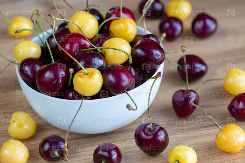 Черешня черная и желтая рассыпанная по столу