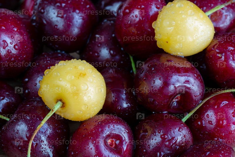 Черешня черная и желтая в каплях воды