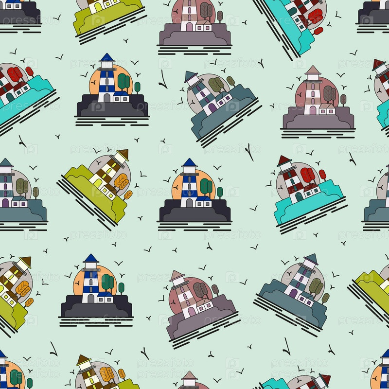 Шаблон маяка. Шрифт матраса. Бесшовный рисунок птиц. Текстура для дизайна. Иллюстрация