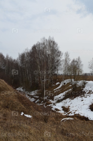 Весенний сельский пейзаж: овраг, сухая трава, тающий снег, деревья, поле, облака