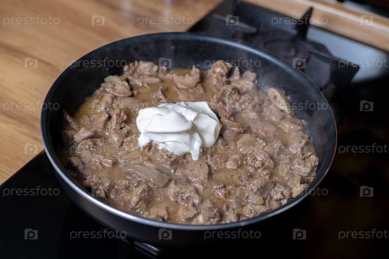 Куриная печень со сметаной в сковороде
