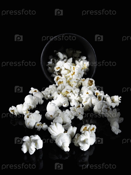 Фронтальный вид попкорна, выпадающего из черного бумажного стаканчика на черном фоне с отражением. Селективный фокус. Вертикальный выстрел. Изолировать